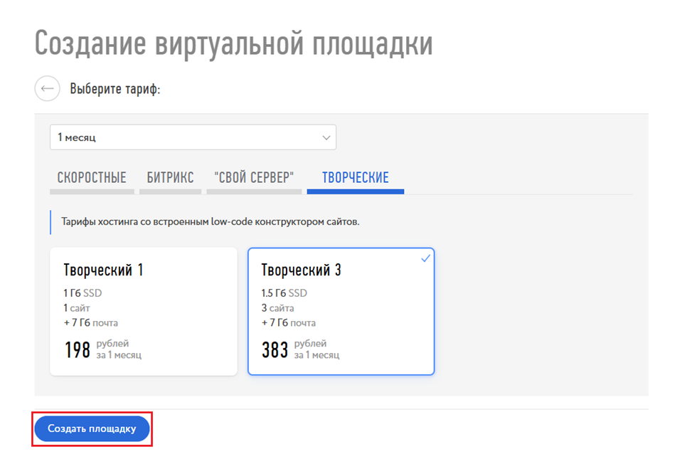 Затем выберите период, группу тарифов «Творческие» и сам тариф. Для заказа выбранной услуги нажмите «Создать площадку».