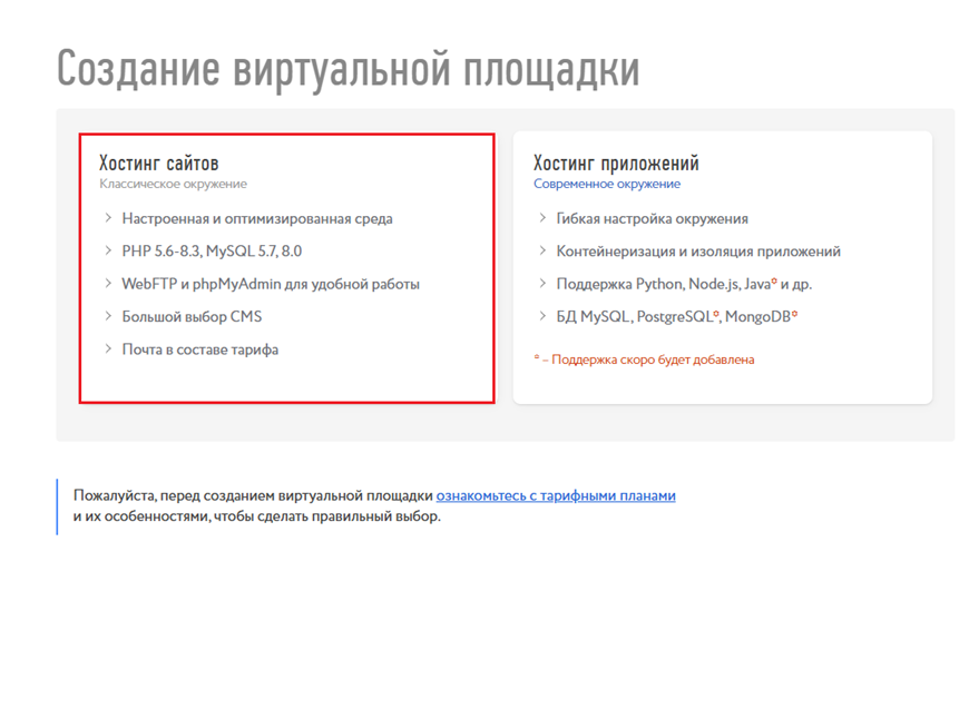 Чтобы начать пользоваться нашим конструктором сайтов, нужно создать площадку по тарифу «Творческий 1» или «Творческий 3», Сделать это можно в Личном кабинете → Раздел «Создание виртуальной площадки».